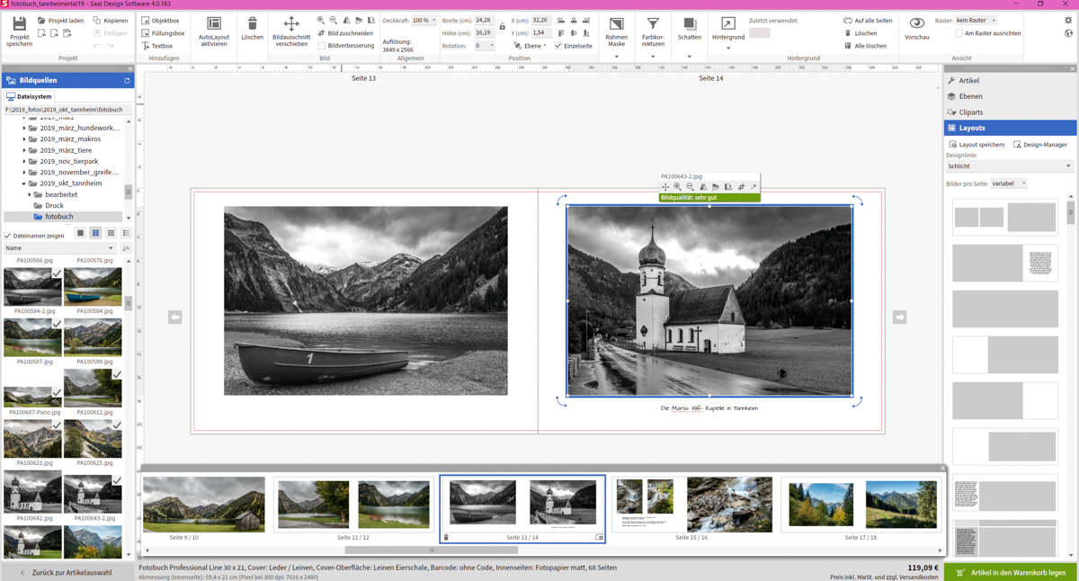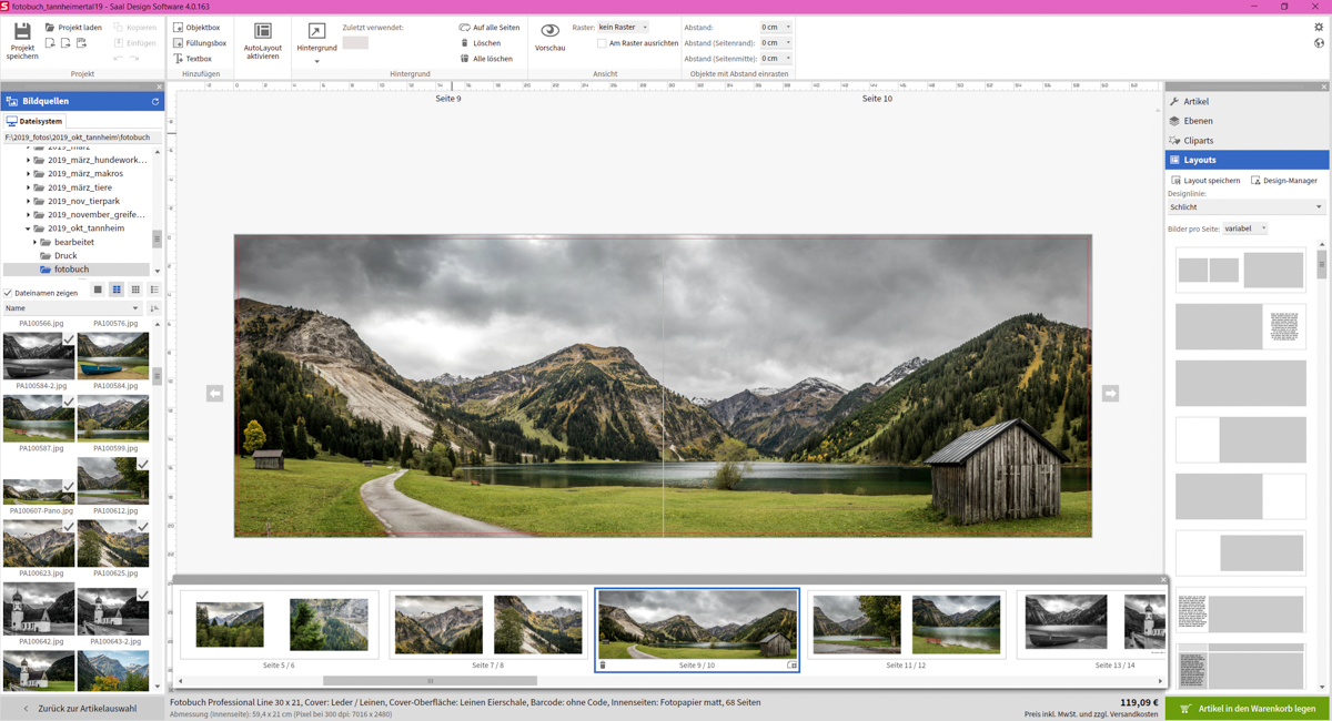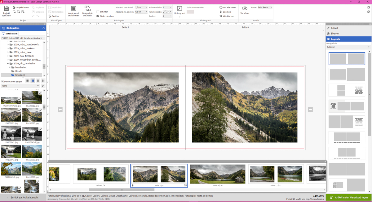Die Saal Design Software ist schnell herunter geladen und lässt sich intuitiv bedienen – obwohl dies mein erstes Fotobuch war, fand ich mich schnell zurecht. Besonders gut gefiel mir, dass das Projekt offline gespeichert werden und somit jederzeit wieder aufgerufen werden, wodurch es möglich war, über mehrere Tage daran zu arbeiten.