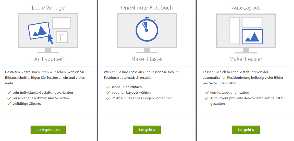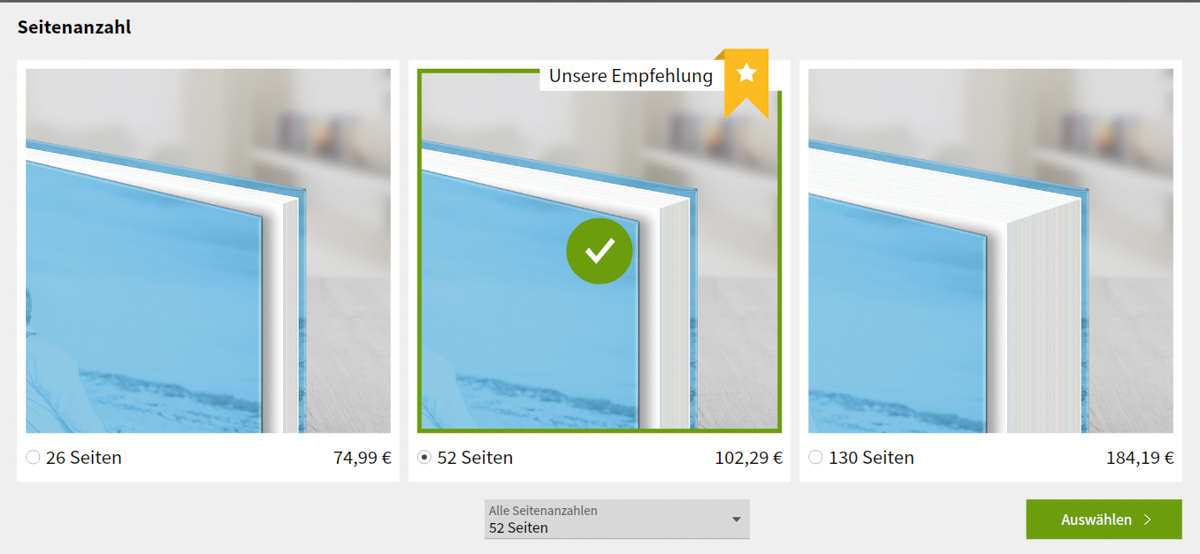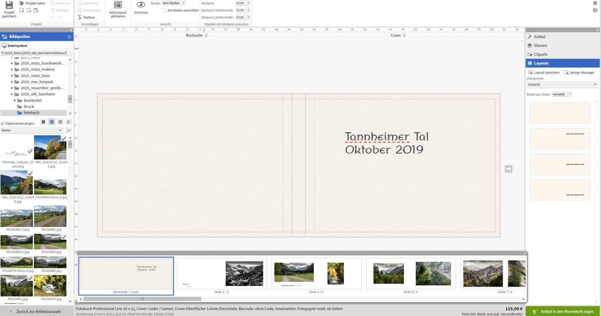 Zuerst wählte ich das Format sowie die Cover-Oberfläche bzw. Oberfläche der Innenseiten aus, wobei ich mich für ein klassisches Leinen-Cover und mattes Fotopapier entschied. Anschließend wurden Layout sowie Seitenanzahl festgelegt, die später jederzeit bspw. durch das Zufügen oder Löschen von Seiten angepasst werden können. Bezüglich des Layouts besteht die Möglichkeit zur freien Gestaltung, dem Auto-Layout oder einem One-Minute-Fotobuch, bei dem die ausgewählten Fotos automatisch dem Fotobuch zugefügt werden.