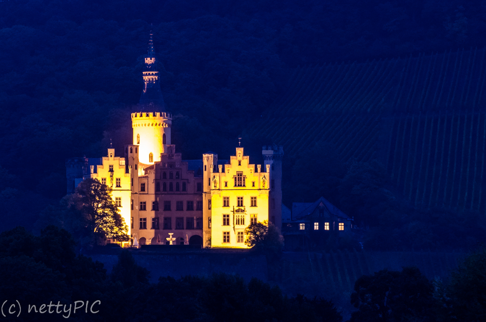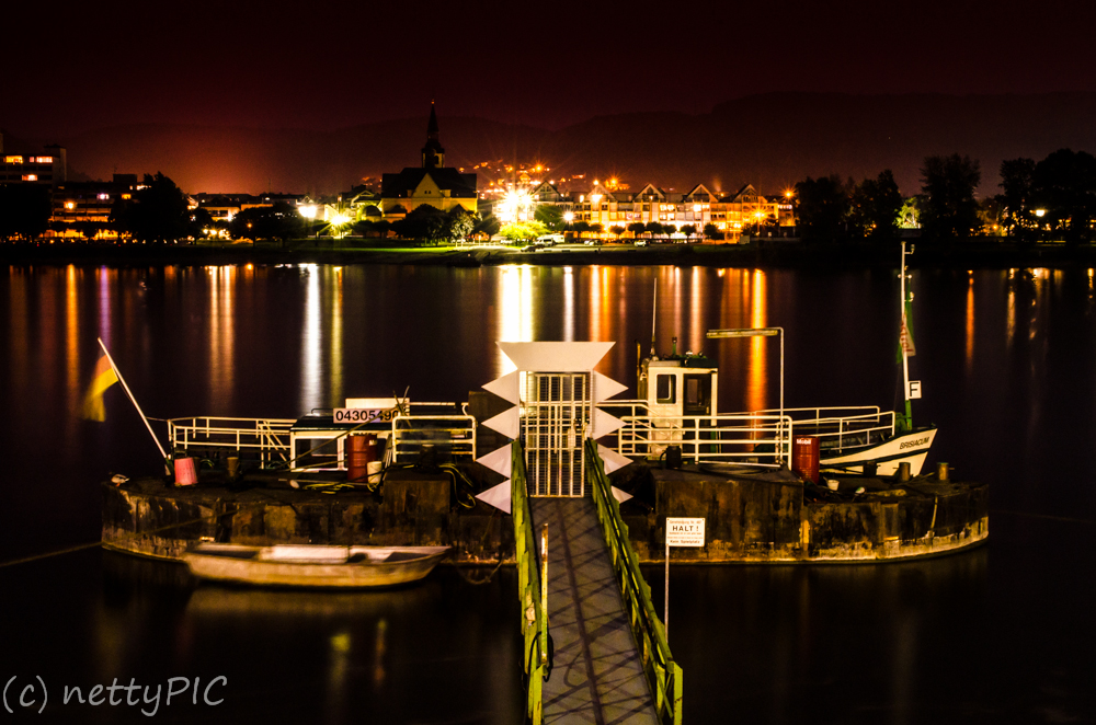 Zum Abschluss des Tages genehmigten wir uns noch eine Pizza in einem netten Lokal am Rheinufer, wo man uns trotz der dreckigen Klamotten und der schlammverschmierten Rucksäcke Einlass gewährte. Anschließend nutzen wir die Gelegenheit zu einigen Nachtaufnahmen der gegenüberliegenden Uferseite, wobei wir uns mit dem Stativ wieder einmal abwechseln mussten, da meins blöderweise im Auto lag – nachdem ich es den ganzen Nachmittag mit mir herumgeschleppt und letztendlich doch nicht benutzt hatte (was sich beim Betrachten der Fotos übrigens als Fehler erwies: Die längeren Verschlusszeiten aus der Hand führten leider nicht immer zum gewünschten Erfolg).