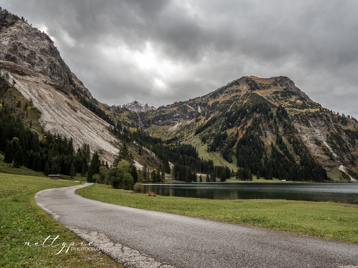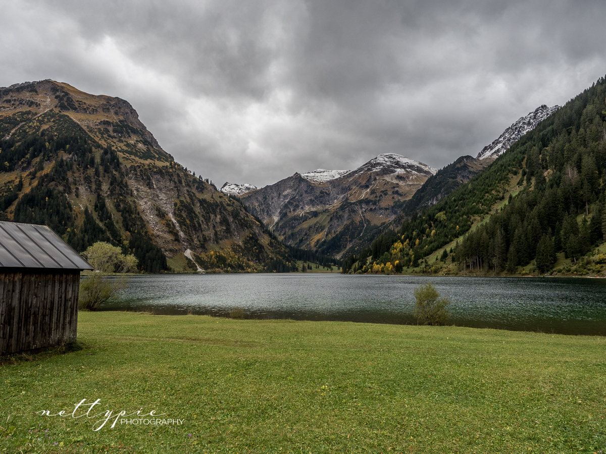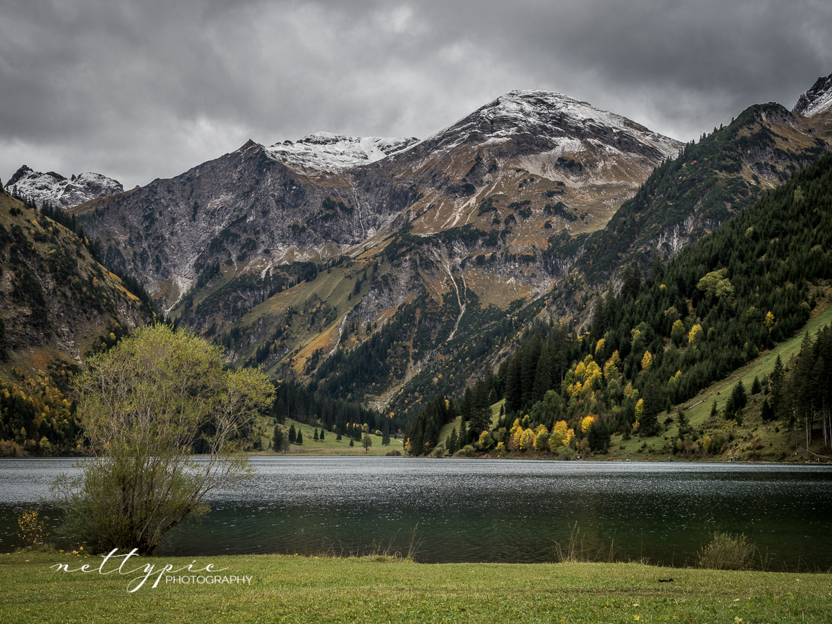 Im Oktober bin ich spontan für einige Tage alleine ins Tannheimer Tal gefahren, um dort einfach mal dem Stress und der Hektik des Alltags zu entfliehen sowie die wunderbare Landschaft bzw. die Natur zu genießen. Es war eine wunderbare, wenn auch leider viel zu kurze Zeit, aus der ich natürlich viele Fotos und unvergessene Erlebnisse mitgebracht habe. Am ersten Tag nach der Ankunft zeigte sich das Wetter noch wechselhaft, so dass ich zum Einstieg erstmal die überschaubare und steigungsarme Strecke von Tannheim/Schmieden zum wunderschönen Vilsalpsee gelaufen bin. Nach einer kleinen Stärkung ging es in strömendem Regen und Sturm zur Vilsalpe und anschließend mit dem Bus nach Tannheim zurück (dabei habe ich die Kamera, die im Rucksack verstaut war, allerdings nicht mehr ausgepackt).