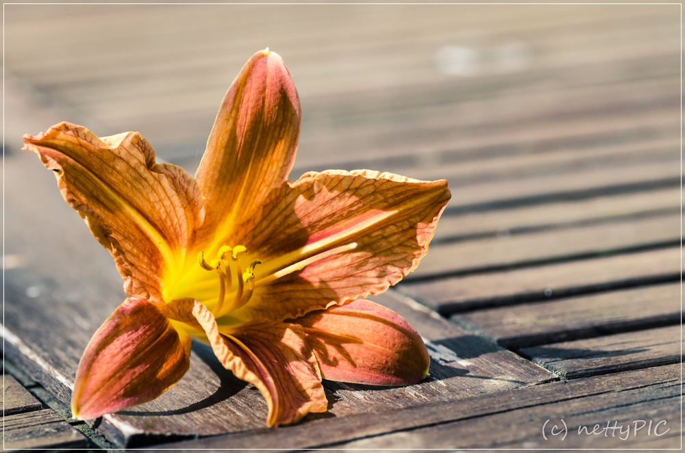 mir gefiel der Kontrast von der zarten Blüte zu dem „alten“ Holztisch ebenfalls sehr gut 😉 .