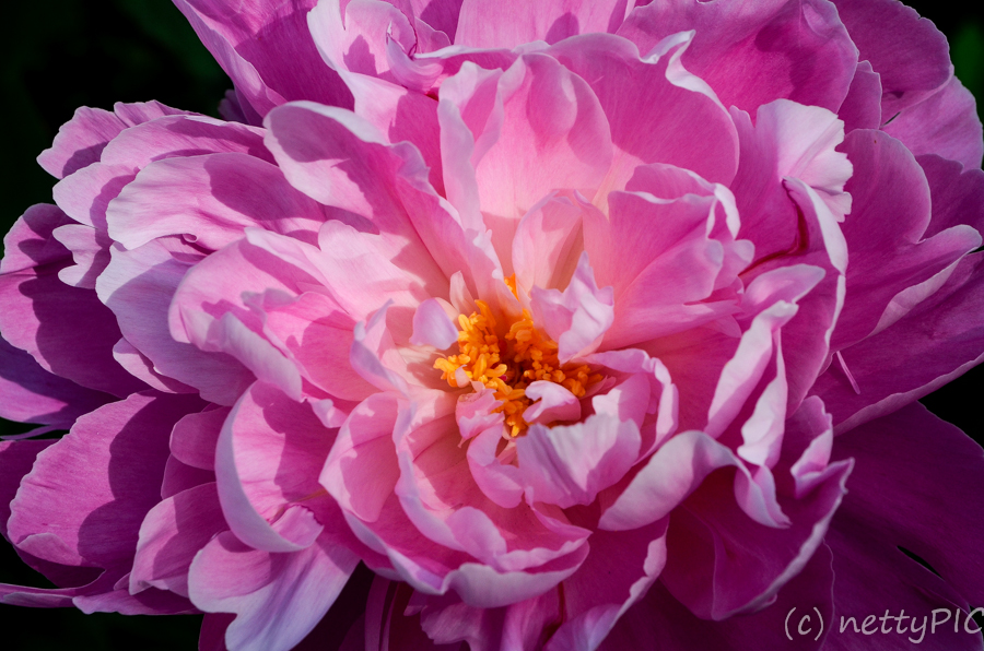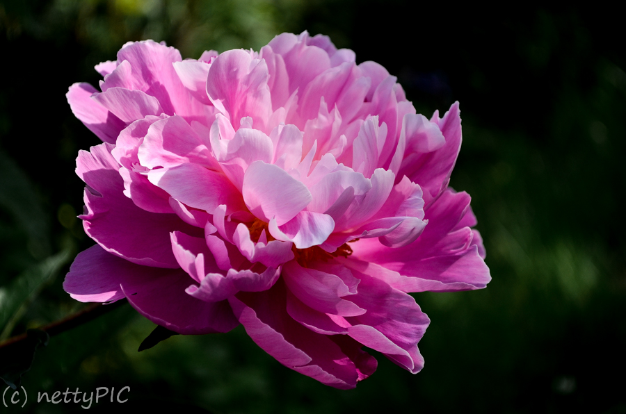 Was solch eine tolle Farbe hat, darf auch farbig bleiben – Rhododendronblüte im Abendlicht (edit: Es handelt sich natürlich um eine Pfingstrose, die sich irgendwie in den Rhododendronbusch verirrt hat 😀 ) :
