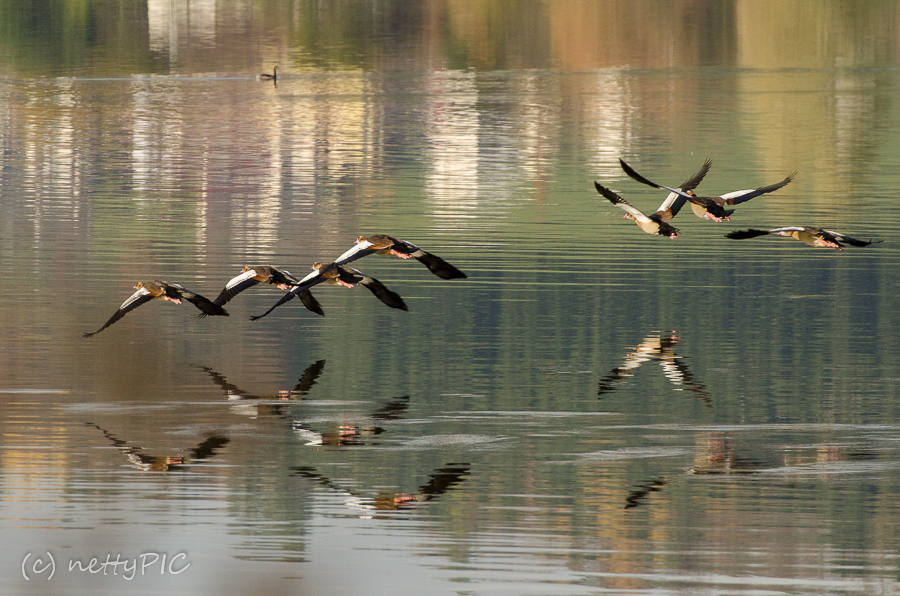 Sehr schöne Bilder. Durch die bunten Farben der Nilgänse bekommt das Wasser selbst viele Farben. Das sieht sehr schön aus. Aber die Gänse im Flug zu erwischen ist natürlich super.