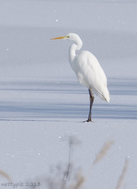 Da ich mir nicht ganz sicher war, um welche Reiherart es sich handelte (Graureiher waren es definitiv nicht), schlug ich in meinem schlauen Naturführer nach und gelangte zu der Erkenntnis, dass ich es mit sogenannten Silberreihern zu tun hatte – nun hätte ich mir unter dieser Bezeichnung eigentlich silberfarbige/hellgraue Tiere vorgestellt, das Gefieder sah jedoch genauso weiß aus wie der Schnee (wobei ich bei der Bearbeitung den Kontrast schon erhöht hatte, damit sich der Vogel überhaupt etwas vom Hintergrund abhebt)…woher also die Bezeichnung „Silbereiher“ ?