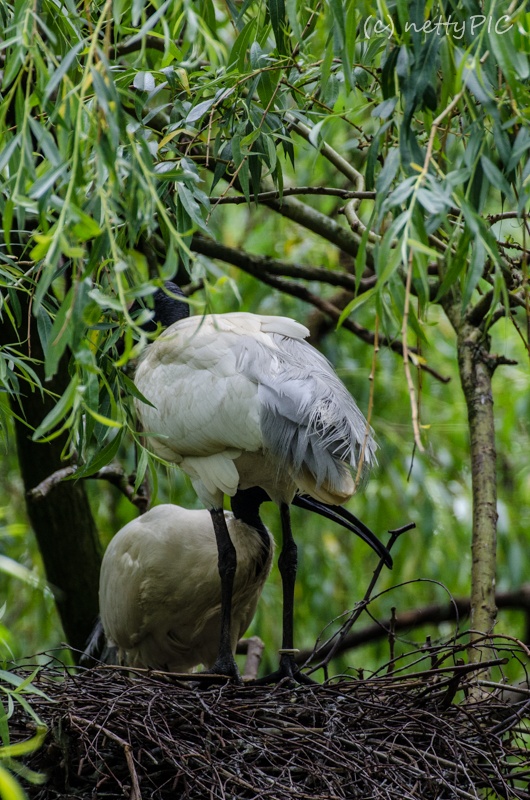 Afrikanischer Strauß und Schwarzkopfibise im Nest