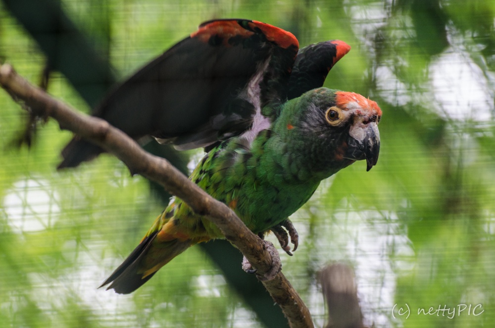 Die Vögel, die nicht in der begehbaren Voliere untergebracht sind, waren etwas schwieriger zu fotografieren- wie dieser Kongopapagei (durch den Zaun fotografiert):